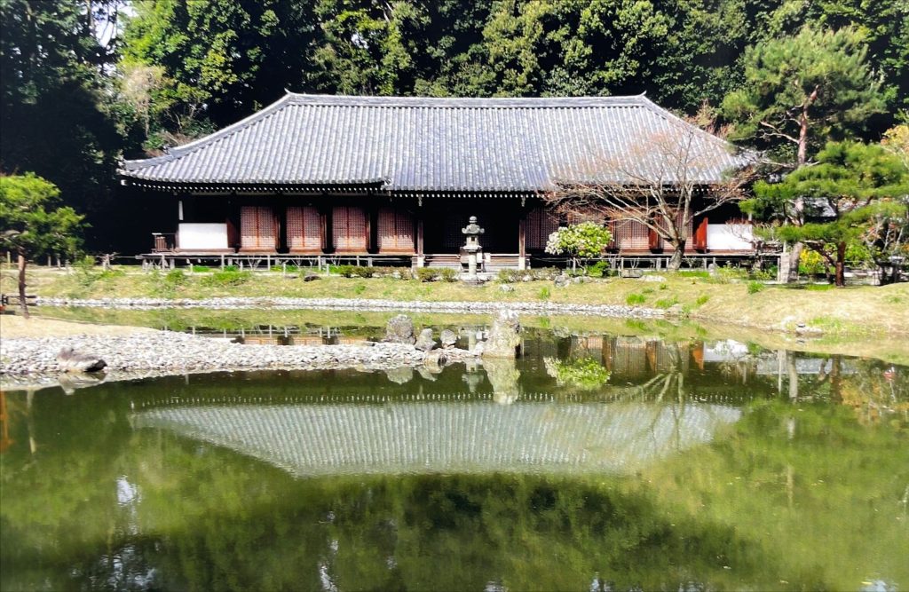 梵字の「阿」字をかたどったと言われる池を中心にして極楽が表現されている木津川市・浄瑠璃寺の境内。池に映る本堂には国宝の九体阿弥陀如来坐像が安置されています。(写真提供:浄瑠璃寺)
