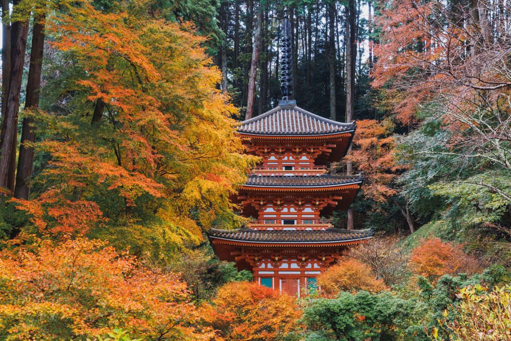 木津川市・岩船寺の山門をくぐり見えてくるのが朱塗りの三重塔(重要文化財)。岩船寺では平安時代の本尊阿弥陀如来坐像(重要文化財)などを拝観します。(写真提供:岩船寺)