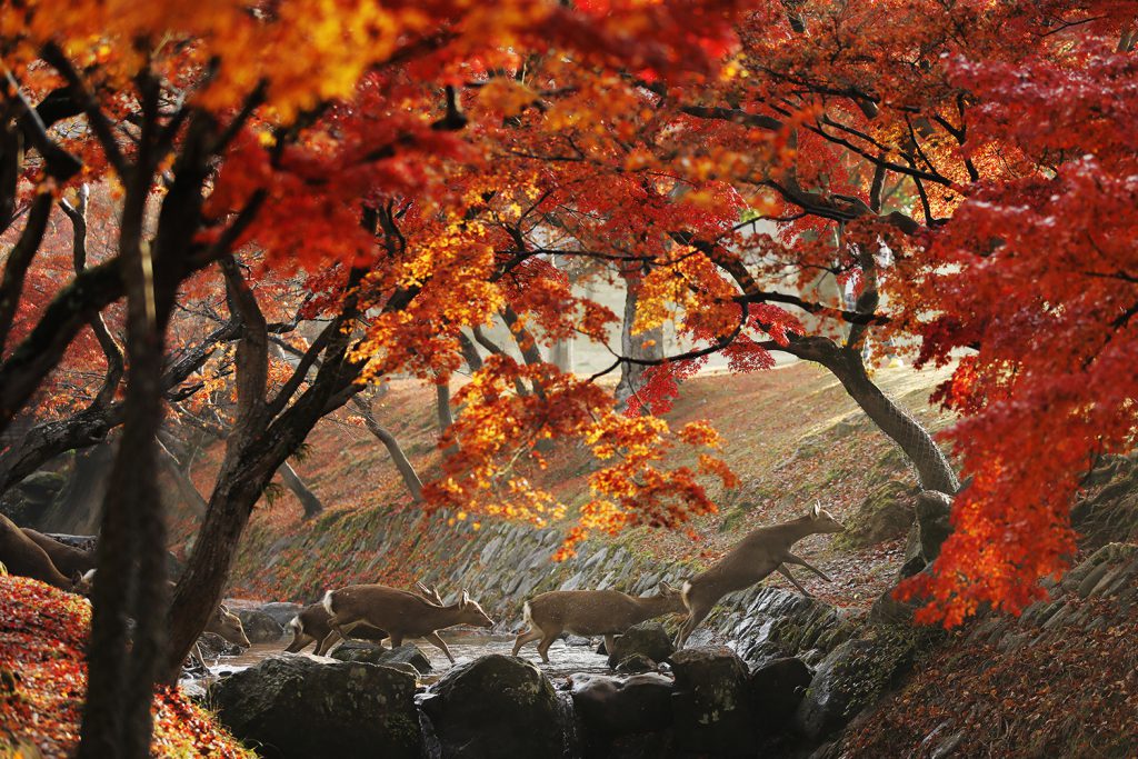 • 紅葉した吉城川の紅葉と鹿の群れ。観光スポットのど真ん中にありながら、幻想的な風景が取れるのが奈良公園の魅力。(撮影:佐藤和斗)