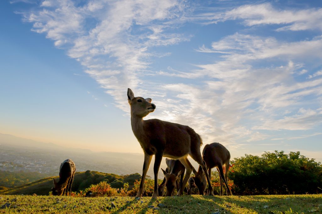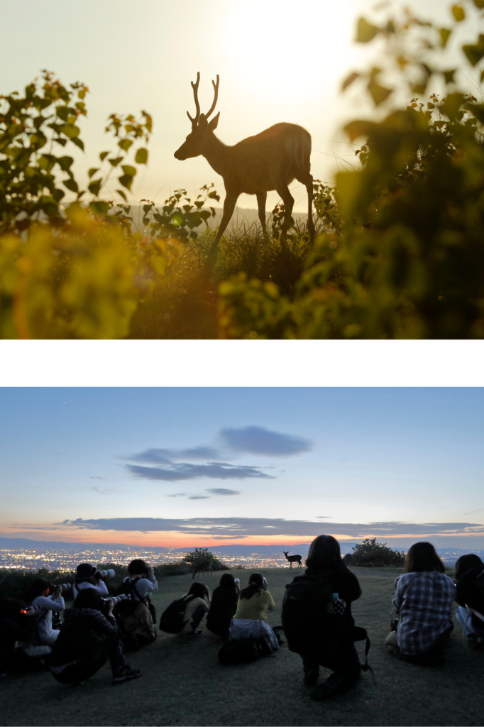 季節の自然と鹿をカメラに収める大人気「奈良の鹿 写真教室」。桜の季節の春の奈良公園、新緑の色増す初夏の若草山、鹿の子模様もかわいい子鹿の誕生シーズンなど、様々なシチュエーションで開講しています。本プランでは撮影講座で撮り方のコツなどを学んだ後、若草山へ。明るいうちから夜景まで移りゆく景色と鹿をとらえていきます。(写真はすべてイメージ 撮影:佐藤和斗)