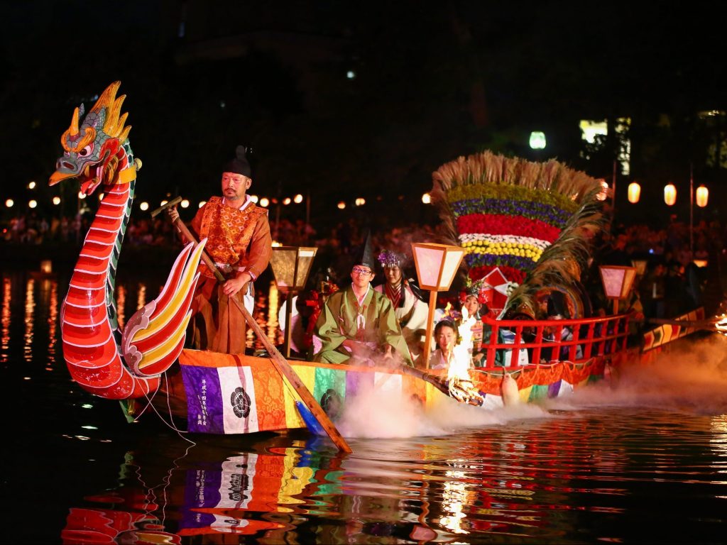 • 采女祭の風景。猿沢池の周りに夜店が立ち並び、神事などが行われます。