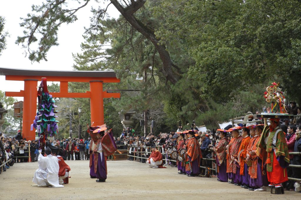 春日大社一之鳥居の参道南北に設置される松の下式桟敷席では、「お渡り式」に参加する芸能集団が様々な芸能を披露します。江戸時代には徳川将軍の名代として奈良奉行が影向(ようごう)の松(能舞台に描かれる松)の前で観閲した伝統ある場所です。