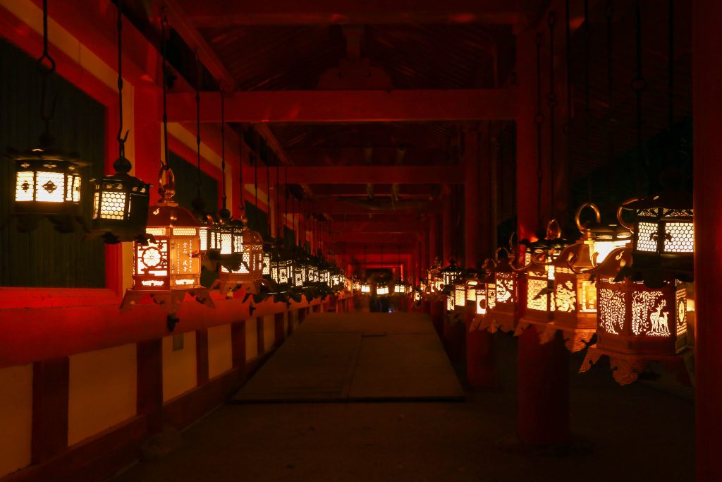 御本社回廊内約1,000基の釣燈籠に浄火が灯され、参加の皆様にも釣燈籠に献灯いただきます。献灯体験が終わる頃には、写真のような幻想的な春日大社の社殿をご覧いただけます。(写真:春日大社万燈籠(回廊))