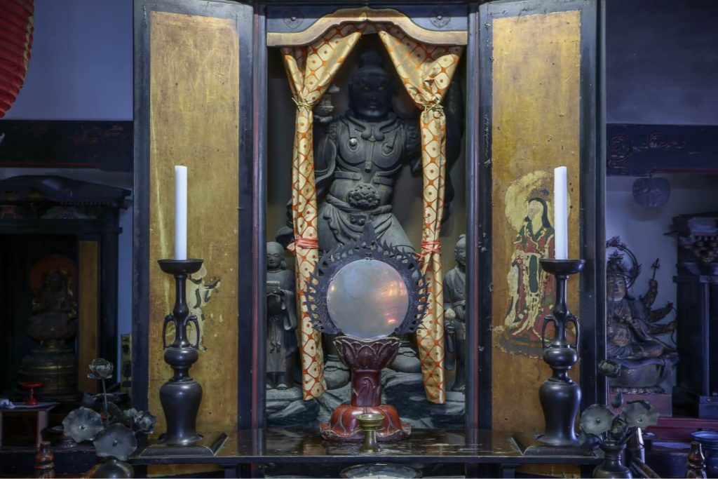 法徳寺の毘沙門堂にまつられた毘沙門天立像。また、本堂では、ご本尊の木造阿弥陀如来立像をはじめ、昨年、奈良国立博物館からお戻りになった仏さまも拝観できます。(写真:法徳寺 毘沙門天立像 写真提供:法徳寺)